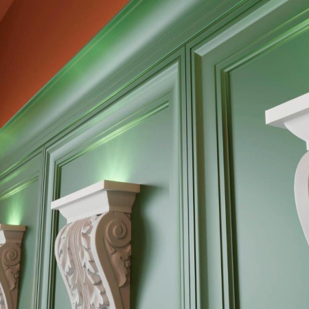 Сдержанный классический карниз, который скроет переход от стены к потолку.