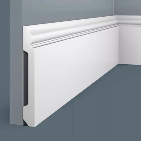 Современный плинтус с линейным дизайном. Благодаря неброскому дизайну этот плинтус может применяться для отделки самых разных интерьеров.